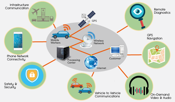 the integrated use of telecommunications and informatics for application in vehicles and to control vehicles on the move
